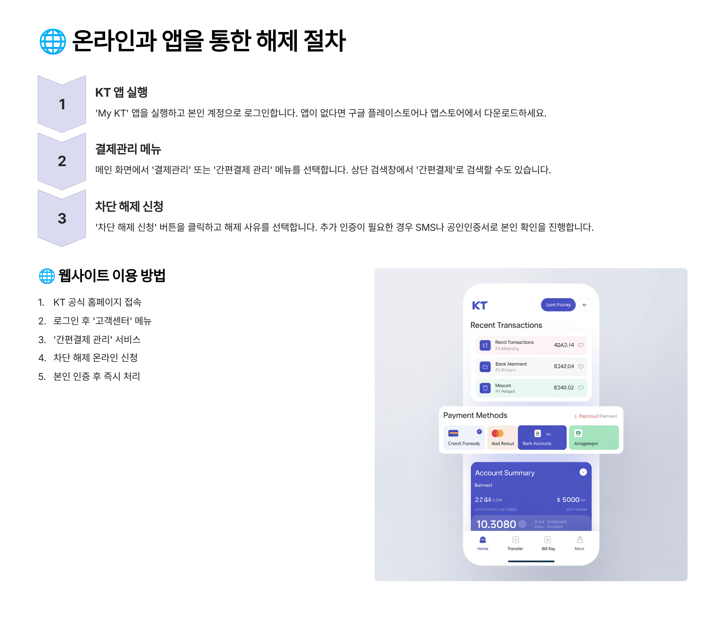 가장 일반적인 방법은 ‘KT 고객센터 앱(마이케이티)’ 또는 ‘KT 홈페이지’를 통한 해제 신청이에요. 본인 인증 절차를 거쳐 간편결제 차단 상태를 해제할 수 있어요.