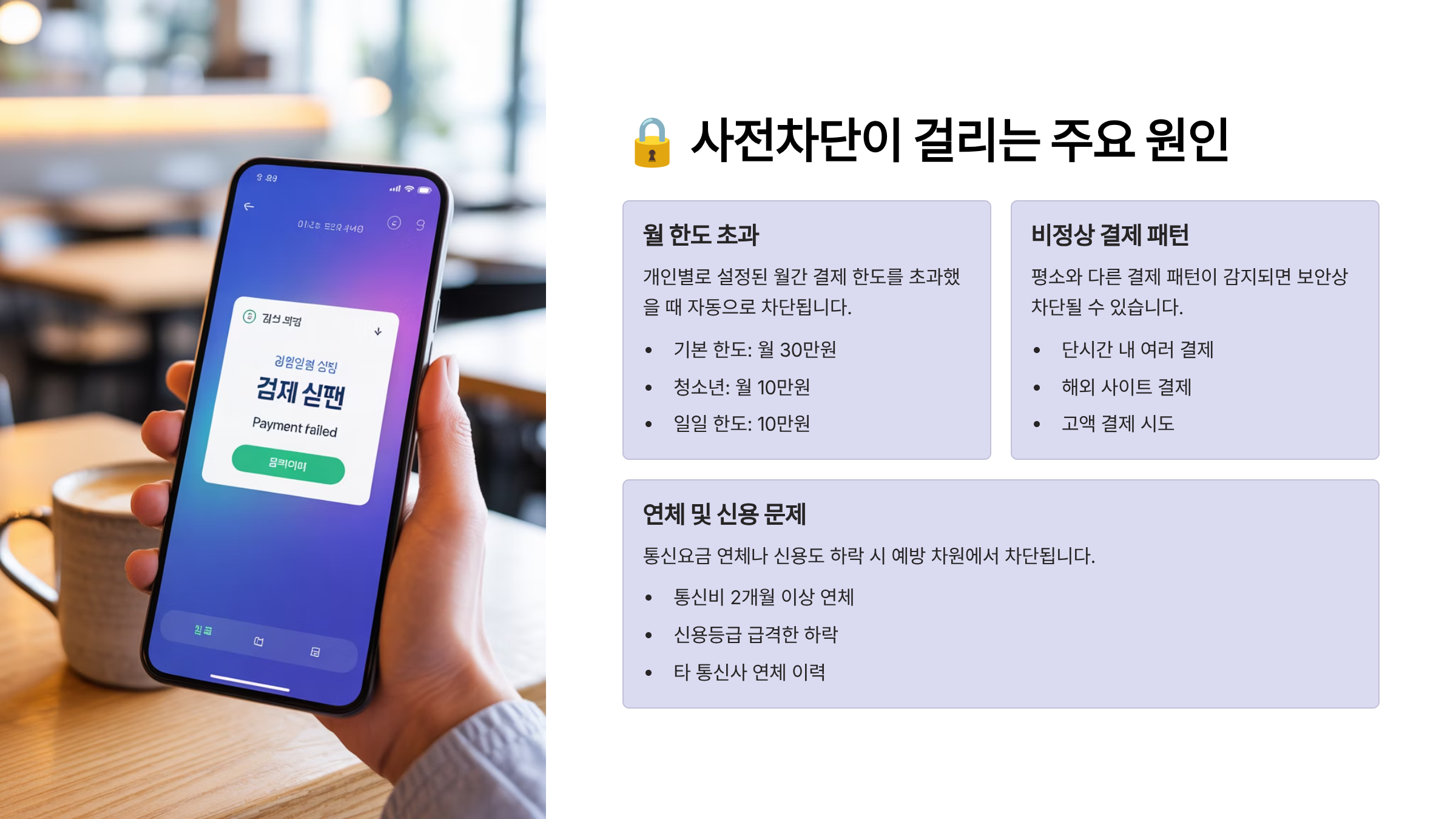 주로 신규 개통 고객, 미성년자, 미납 이력이 있는 사용자, 의심 거래가 감지된 회선에 사전차단이 걸리게 되며, 이 경우 간편결제가 일시 중단돼요. 이 차단은 일정한 조건을 만족하면 해제할 수 있어요.