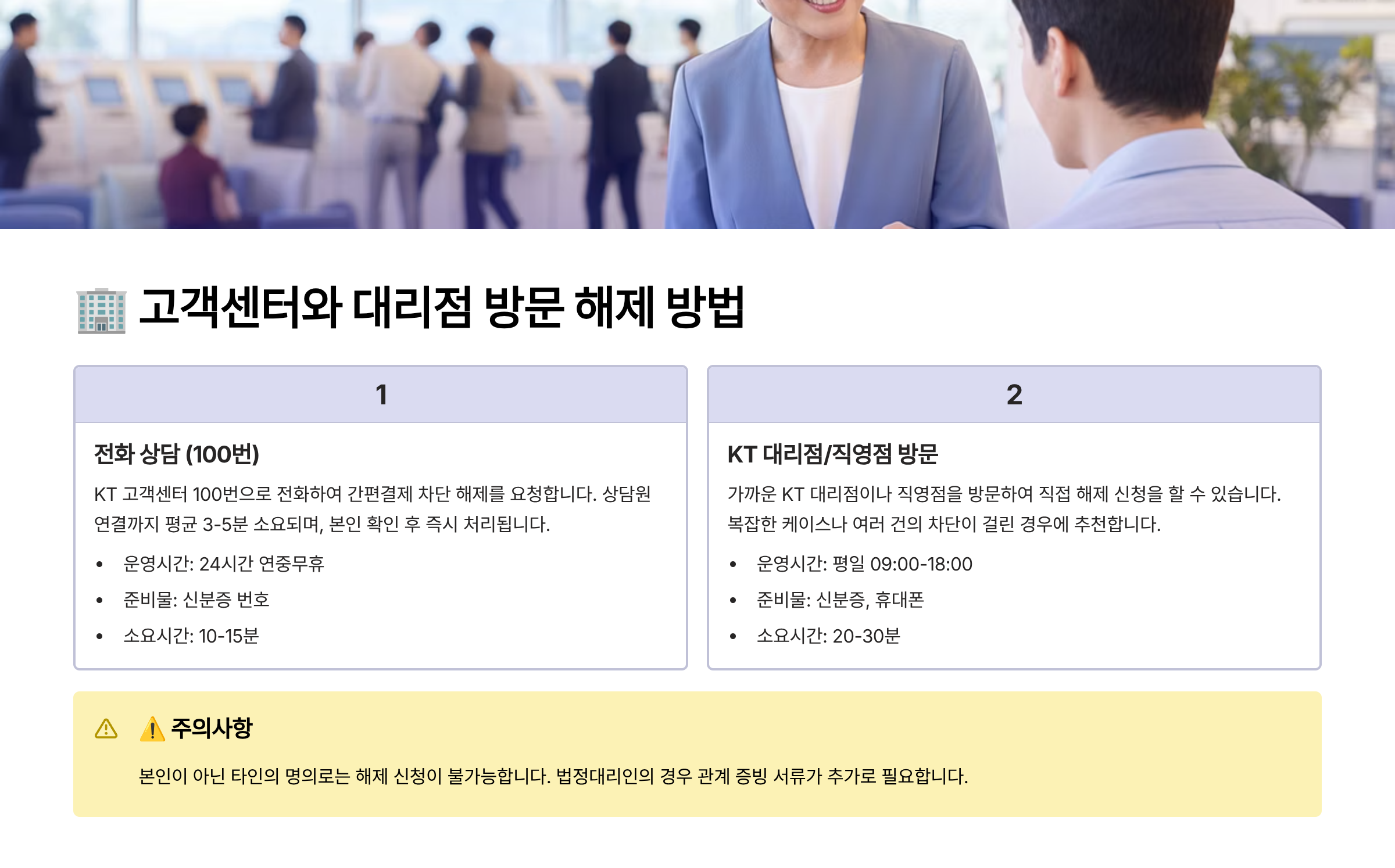 온라인으로 해제가 어려운 경우, 고객센터나 KT 대리점에서 직접 해제 요청을 할 수 있어요. 특히 법인 명의 회선, 보호자 동의가 필요한 회선, 신분증 확인이 필요한 회선은 방문이 필수예요.