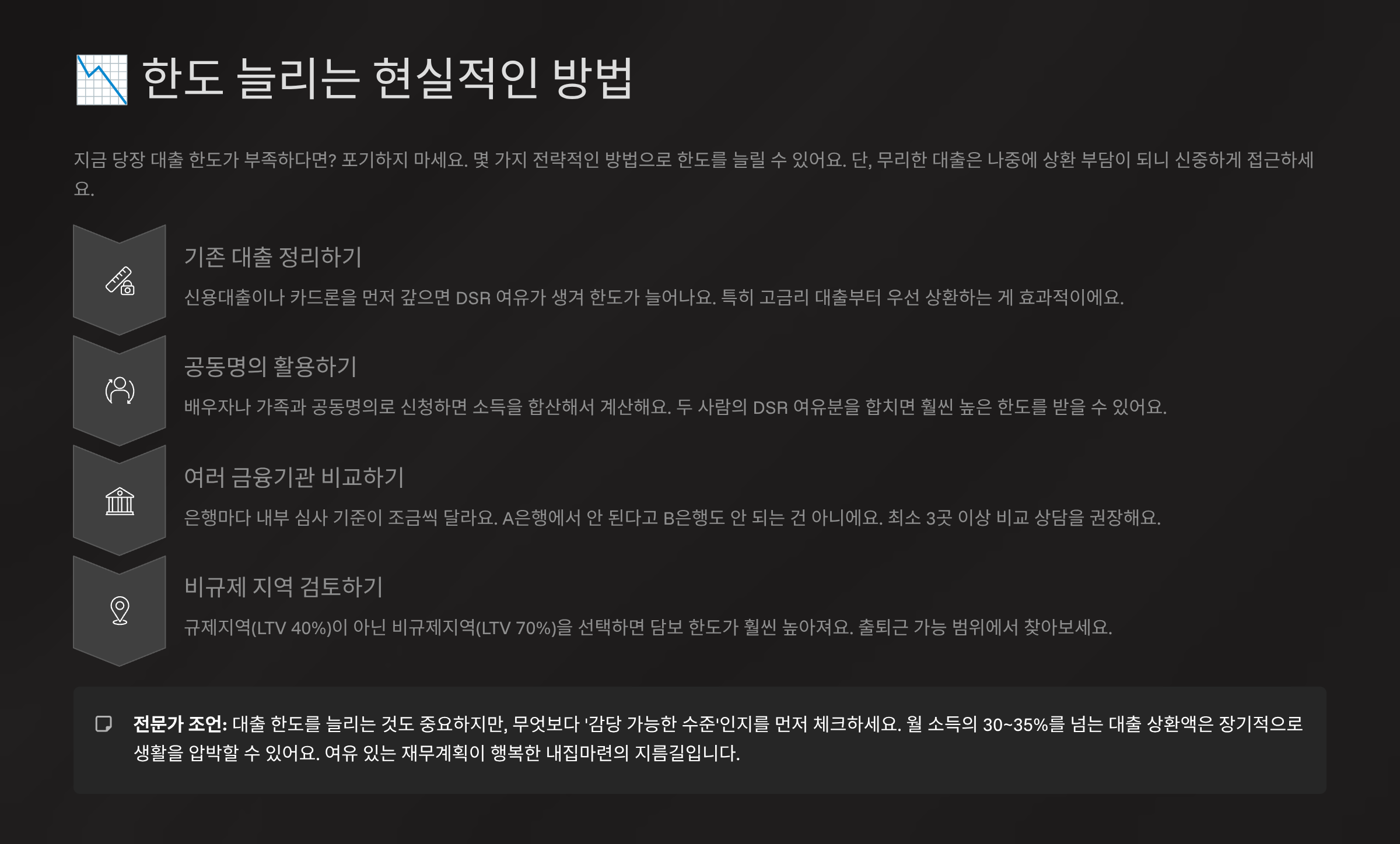 대출한도를 늘리는 건 단순히 돈을 더 빌리는 차원을 넘어서, **더 나은 조건으로 내 집 마련**을 할 수 있는 전략이에요. 무작정 대출 신청하는 것보다, 한도에 영향을 주는 요소들을 미리 조율하면 훨씬 유리해질 수 있어요.