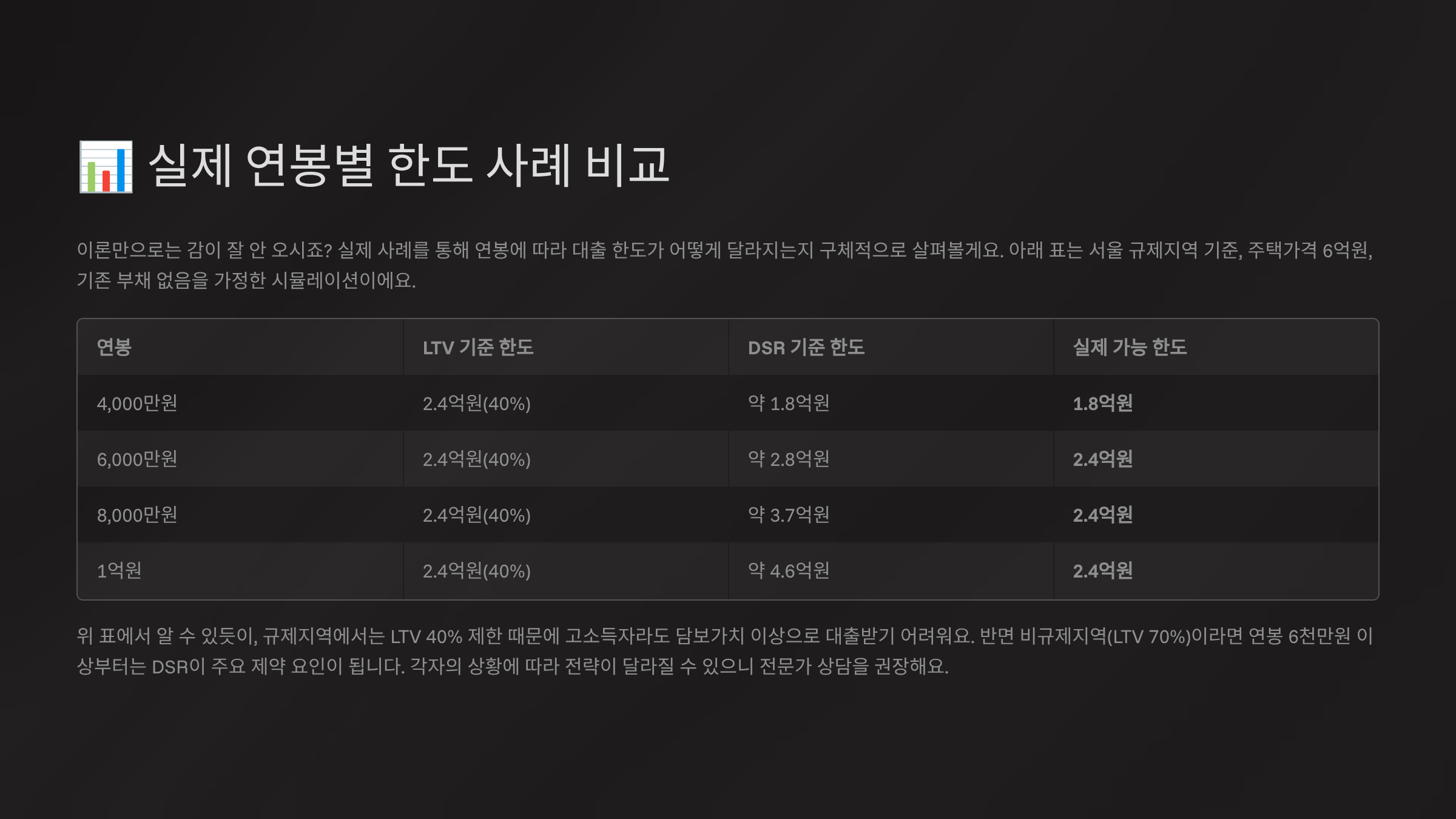 부동산담보대출을 받을 때 가장 궁금한 건 "과연 내가 얼마나 빌릴 수 있을까?"예요. 연봉이 4천, 6천, 1억일 때 각각 얼마까지 가능할지, 요즘 금융기관은 어떤 기준으로 한도를 정하는지 지금부터 하나씩 풀어드릴게요.