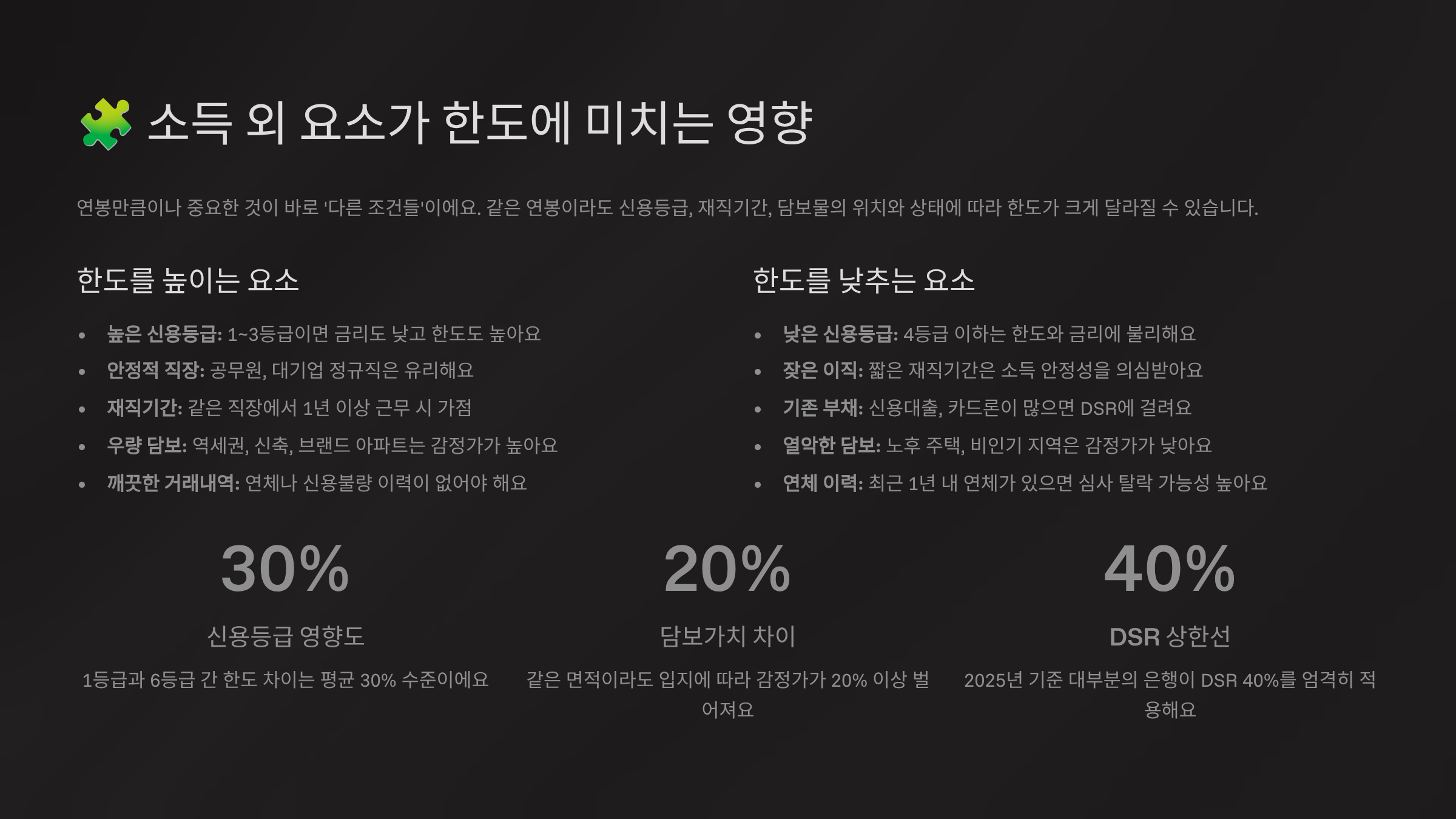 대출한도는 단순히 연봉만으로 결정되지 않아요. 실무에서는 오히려 **소득 외 요소**가 더 중요한 경우도 많아요. 특히 금융기관은 대출을 실행하기 전 ‘상환 가능성’을 다각도로 평가하죠.